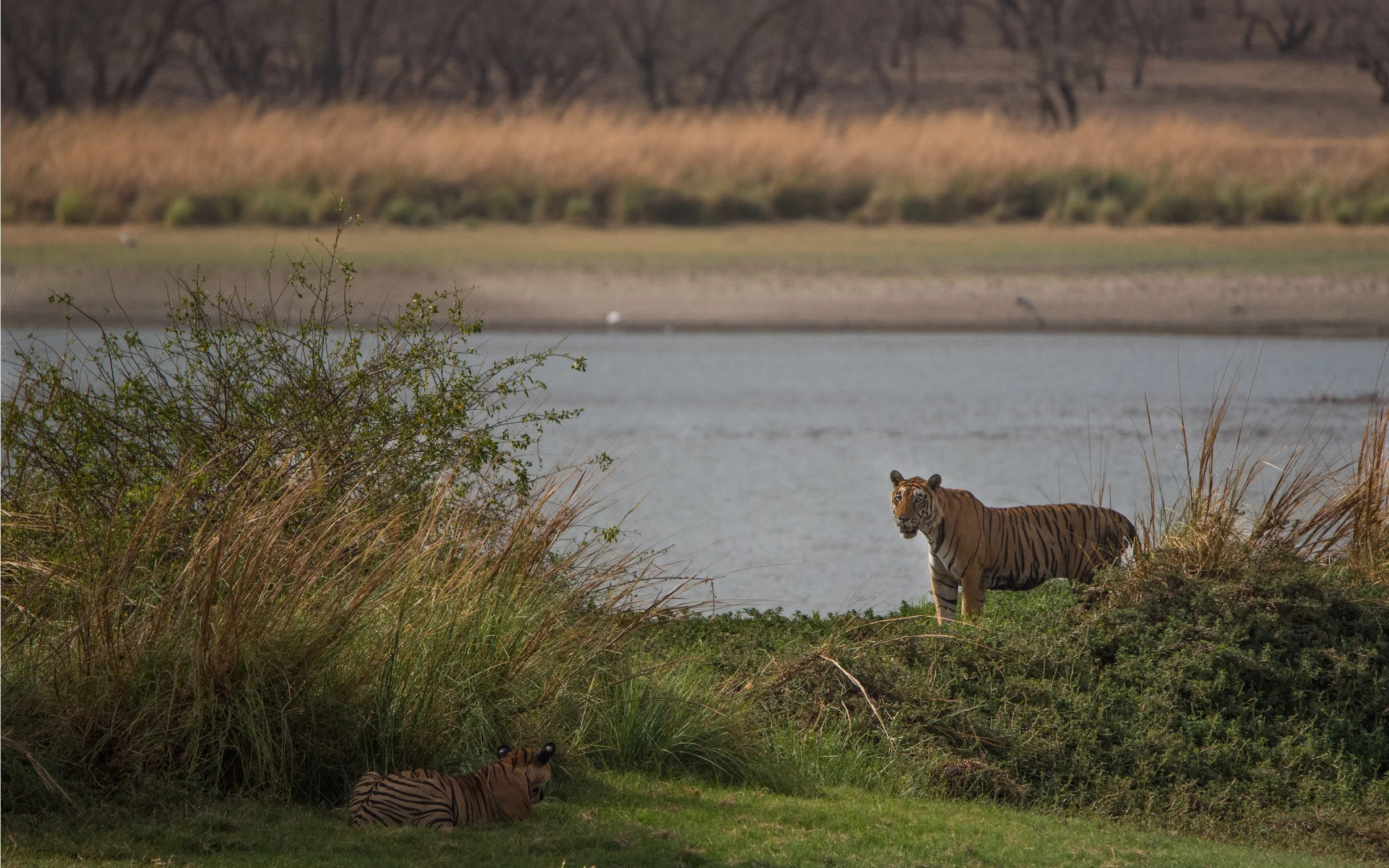 Father T28 (Starmale) and son T85 (Pacman) sizing up each other at Legendary Rajbaug Lake.