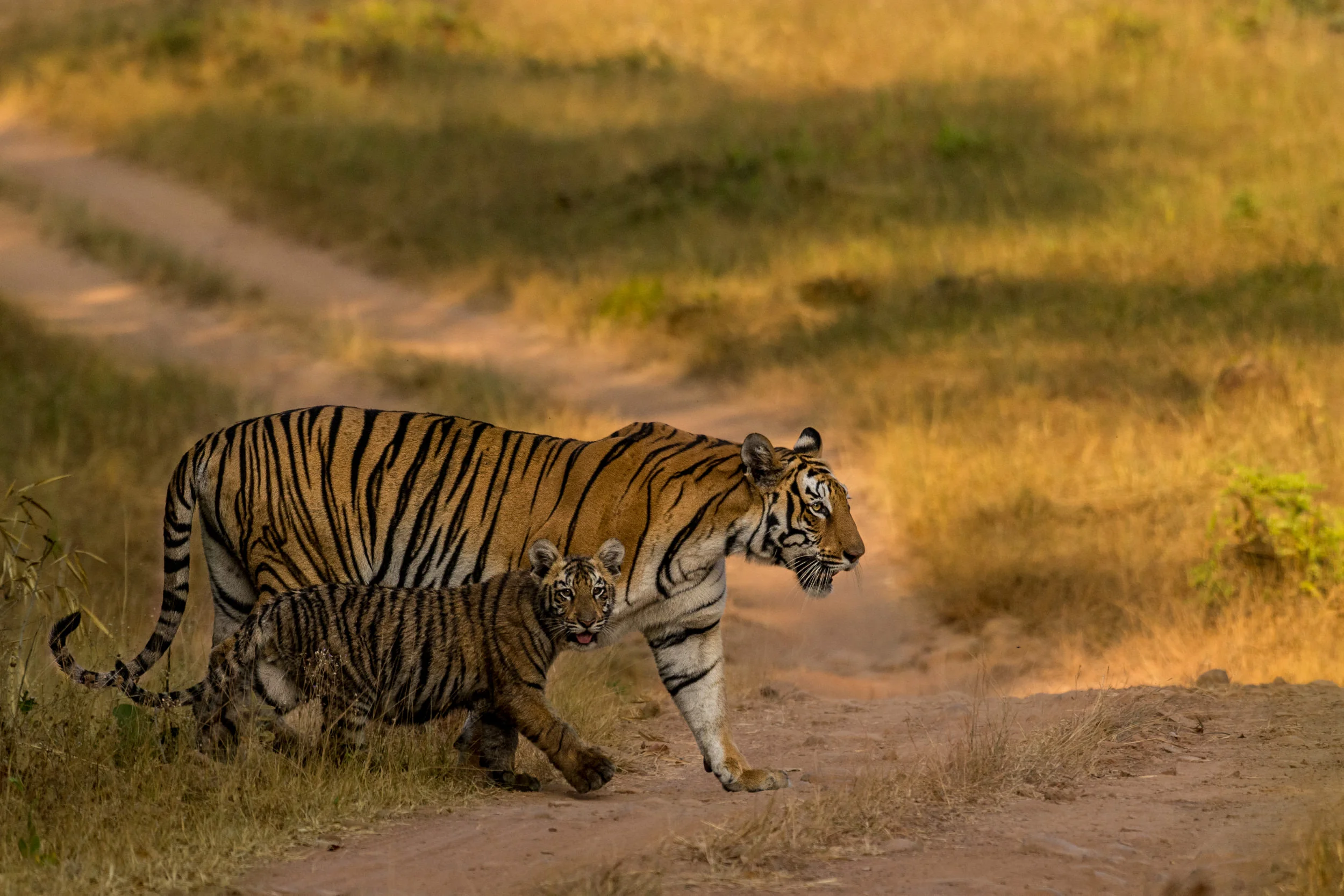 Cropping. I don't like cropping, but it is sometimes necessary... This is a high-resolution image (6000x4000; 24mp) so can withstand some cropping. In this instance I cropped the image slightly to place the tigers closer tot the bottom left corner. Generally it looks better if the subject is walking into the frame.