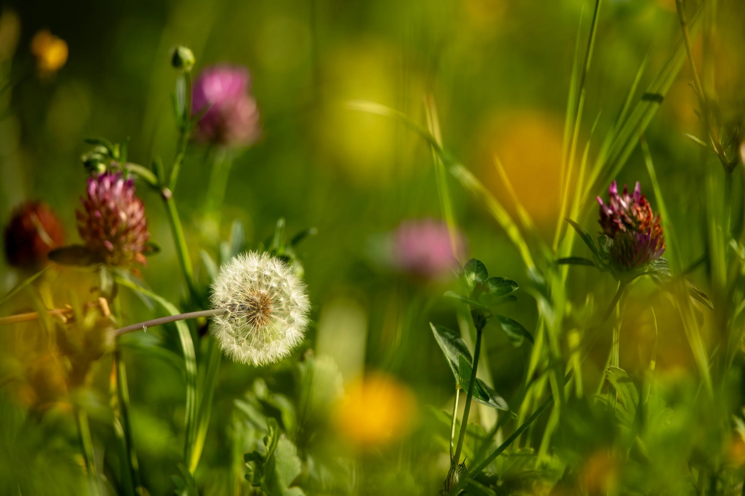 Compressed Meadow: Shot on a 500mm lens, this perspective collapses the depth of a spring field. A single dandelion seed head holds the focus, isolated against a dense, compressed wash of vibrant green, yellow, and purple bokeh.