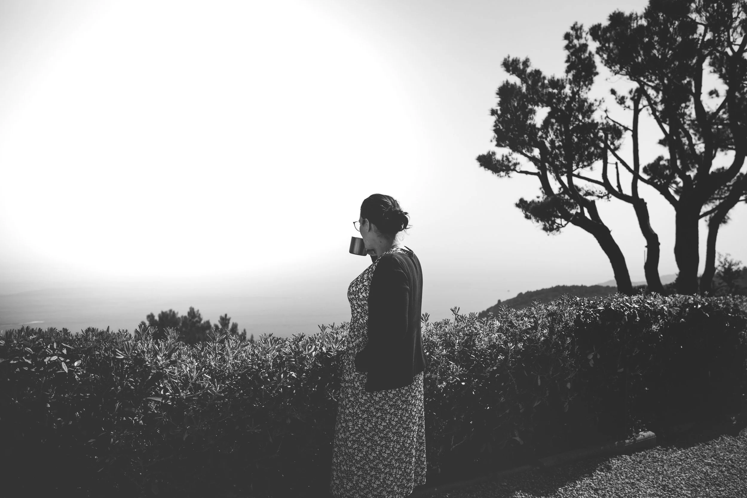 Morning Over the Mediterranean: A quiet, monochrome moment at the start of the day. Looking out over the hazy coastline with a warm drink in hand, finding stillness before the world wakes up.