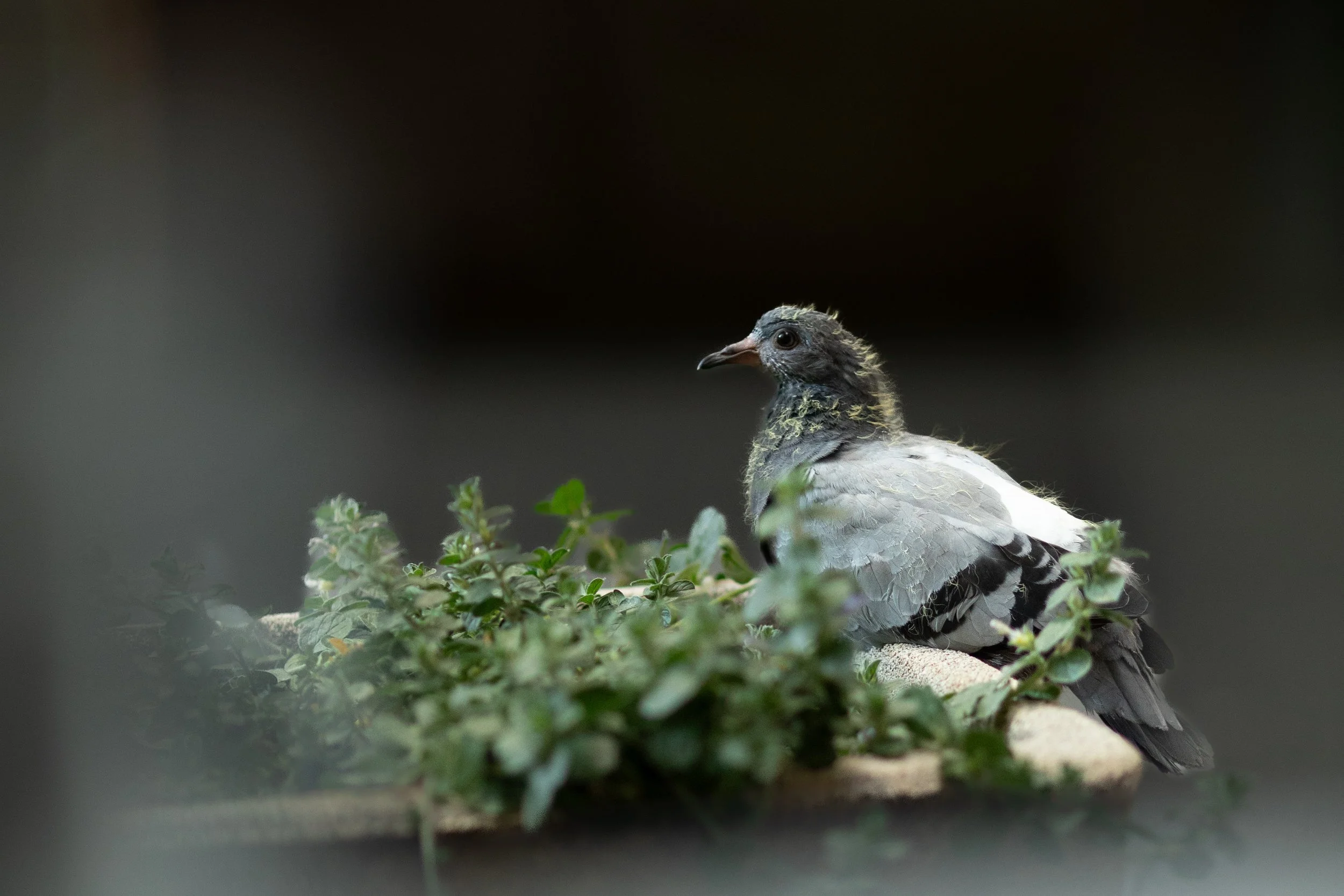 New Life in distress: A young pigeon, still sporting its fuzzy yellow down, resting among the herbs in a plant pot on a busy square. A gentle reminder of the constant cycle of life happening right now and the struggles therein.