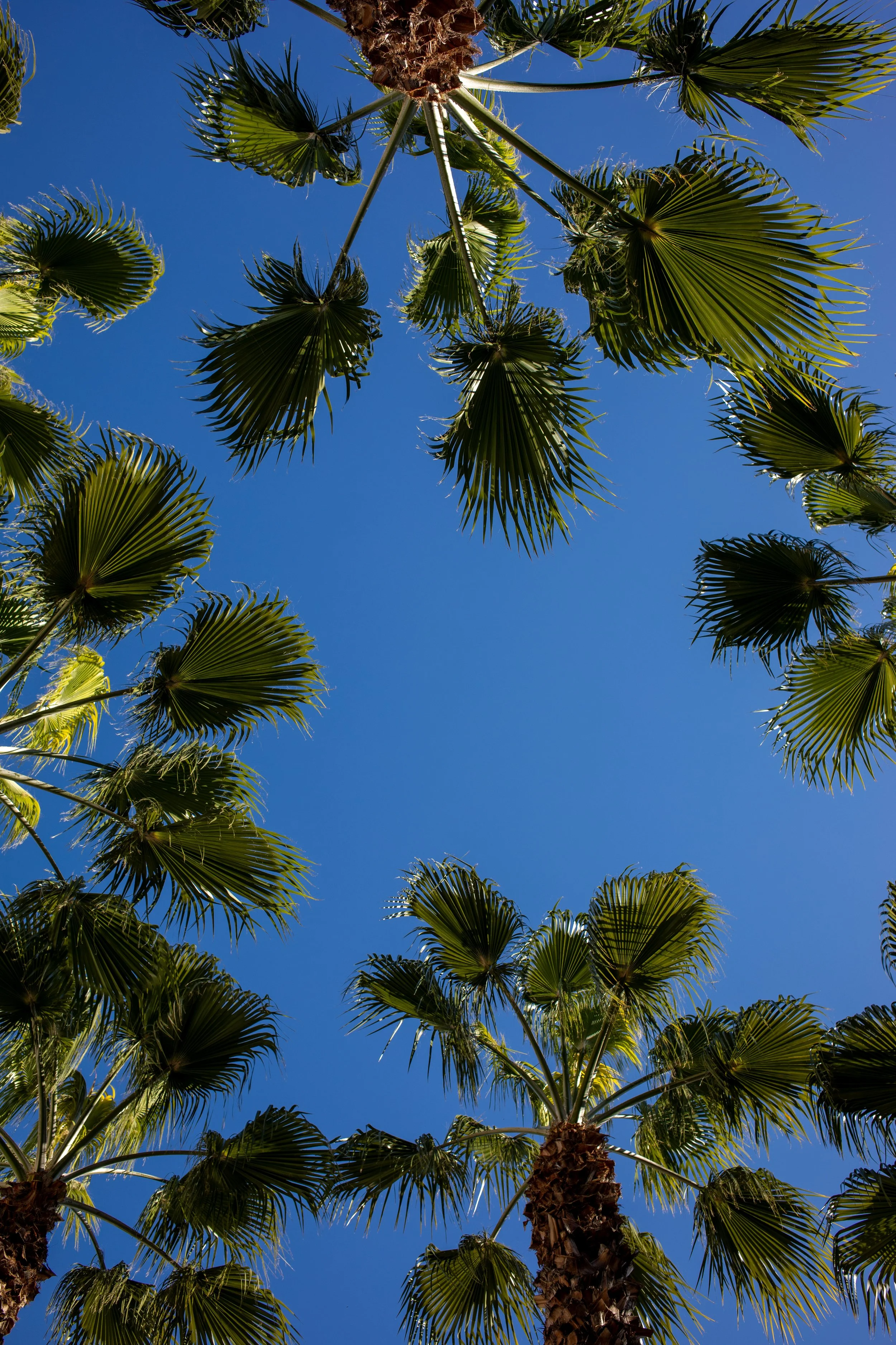 Sky Windows: A rhythmic upward gaze into a saturated blue. The radiating palm fronds frame the sky, creating a natural geometric pattern that feels like an exhale. It captures the sharp, clean energy of a coastal afternoon.
