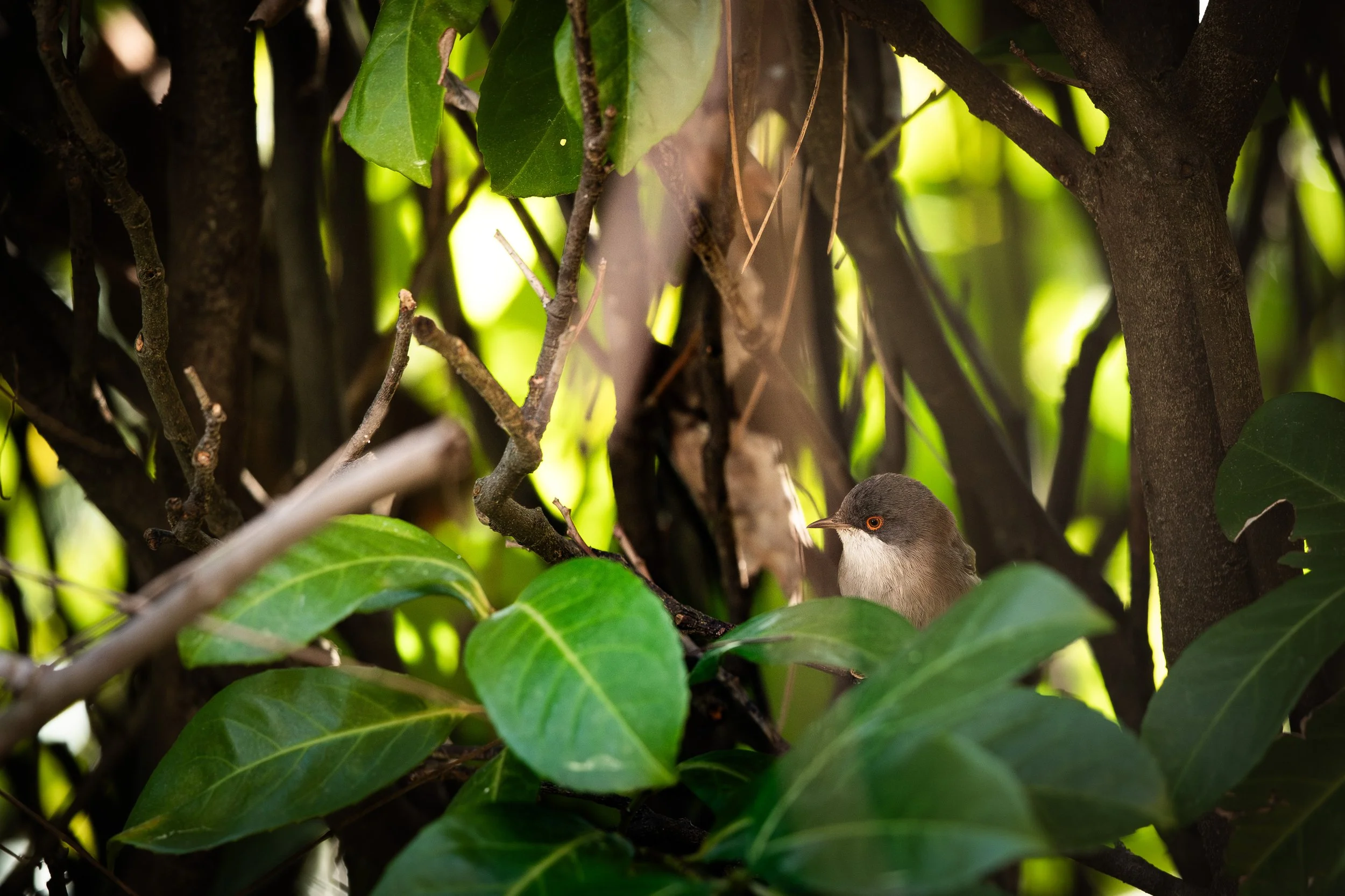 The Ruby Eye: A glimpse into the hidden life of the thicket. Tucked away within a labyrinth of emerald leaves and tangled stems, the Sardinian Warbler pauses for a fleeting heartbeat. Its vibrant red eye-ring burns with a fierce intensity against the cool shadows—a tiny, vivid spark of life in the deep green quiet.