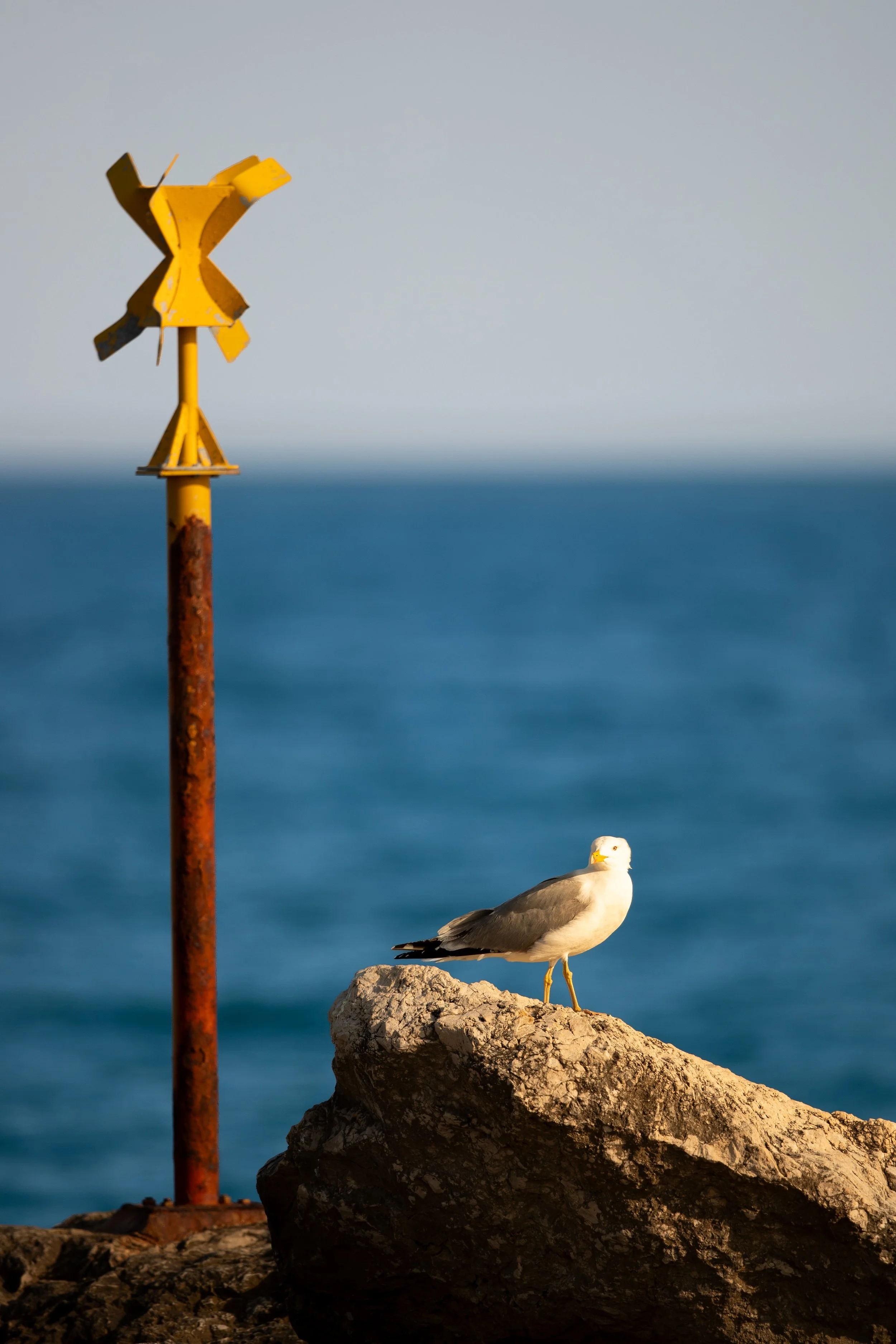 The Coastal Sentinel: Sun-drenched and salt-aired. A Yellow-legged Gull claims its throne on a jagged rock, bathed in the warm, low light of the afternoon. Beside it, a rusted maritime marker stands as a weathered companion, both anchored against the deep, rhythmic blue of the Mediterranean.