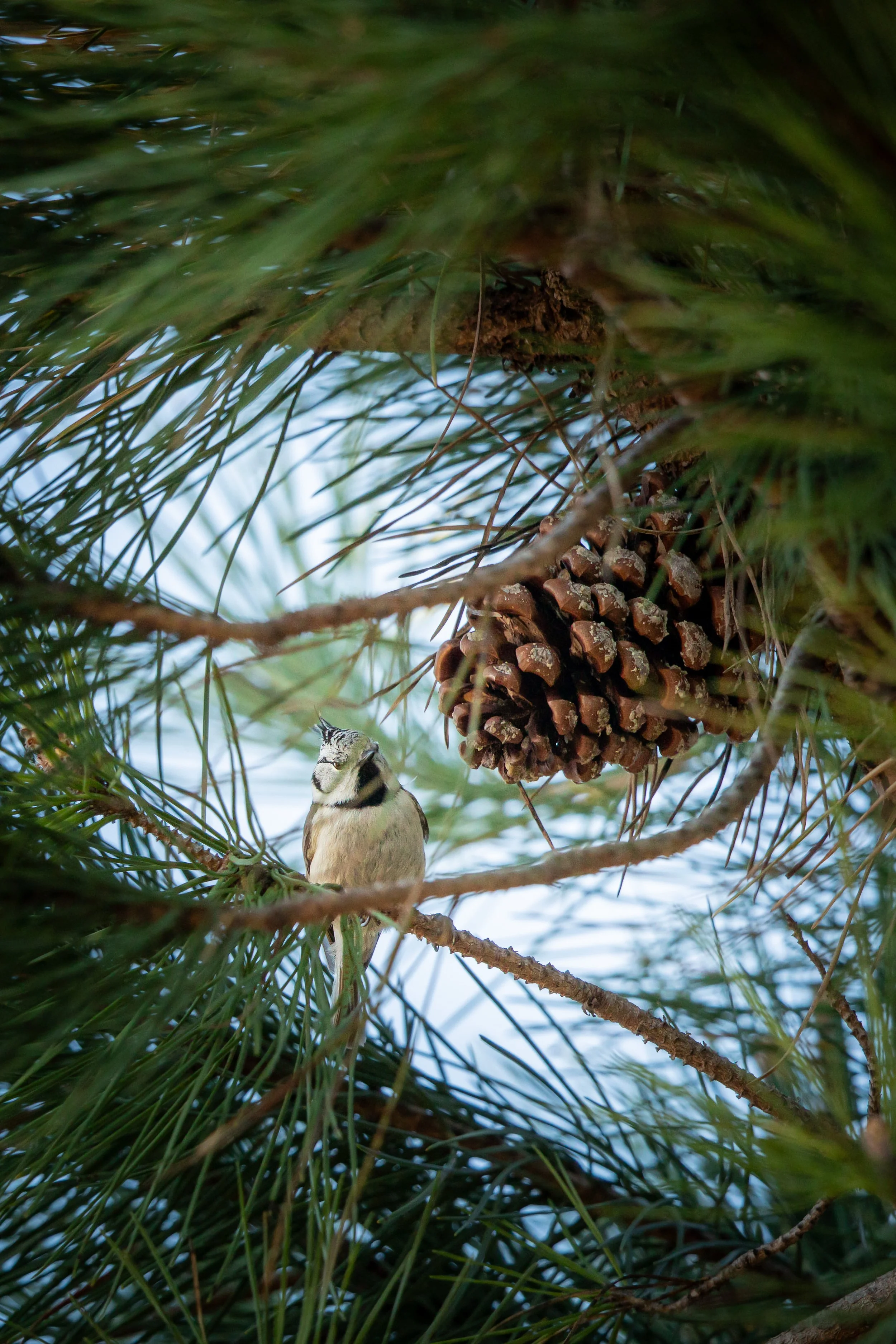 The Punk of the Pines: A momentary pause in a life of constant motion. Perched beneath the heavy weight of a ripening pine cone, the Crested Tit peers out through a screen of needles. With its signature feathered crown and bold, monochromatic mask, it looks like a tiny, watchful spirit of the high branches.