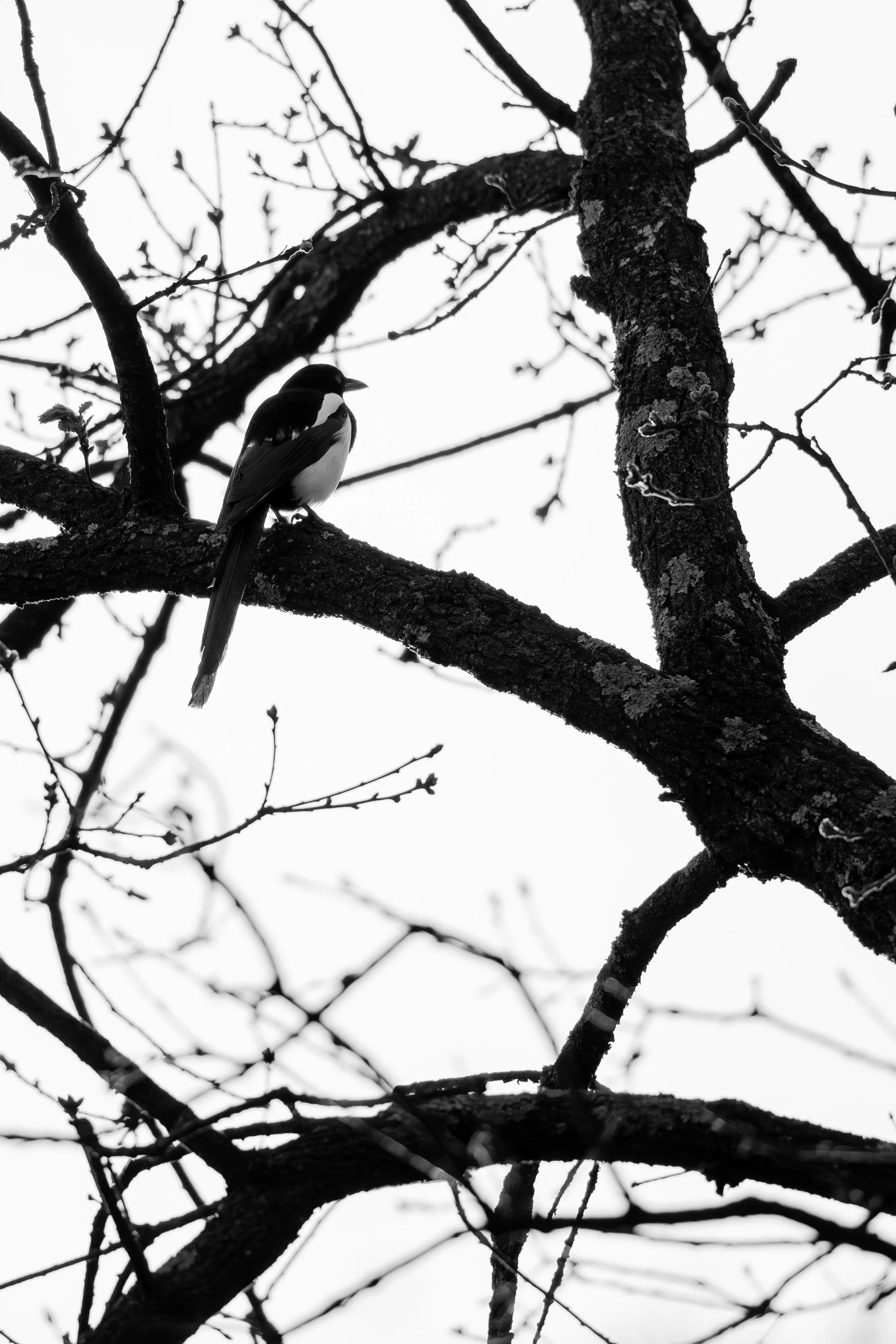 Monochrome Magpie: A high-contrast, black and white study of a Magpie perched among a network of bare branches. By stripping away the colour, the image emphasises the bird's iconic silhouette and the complex patterns of the tree.