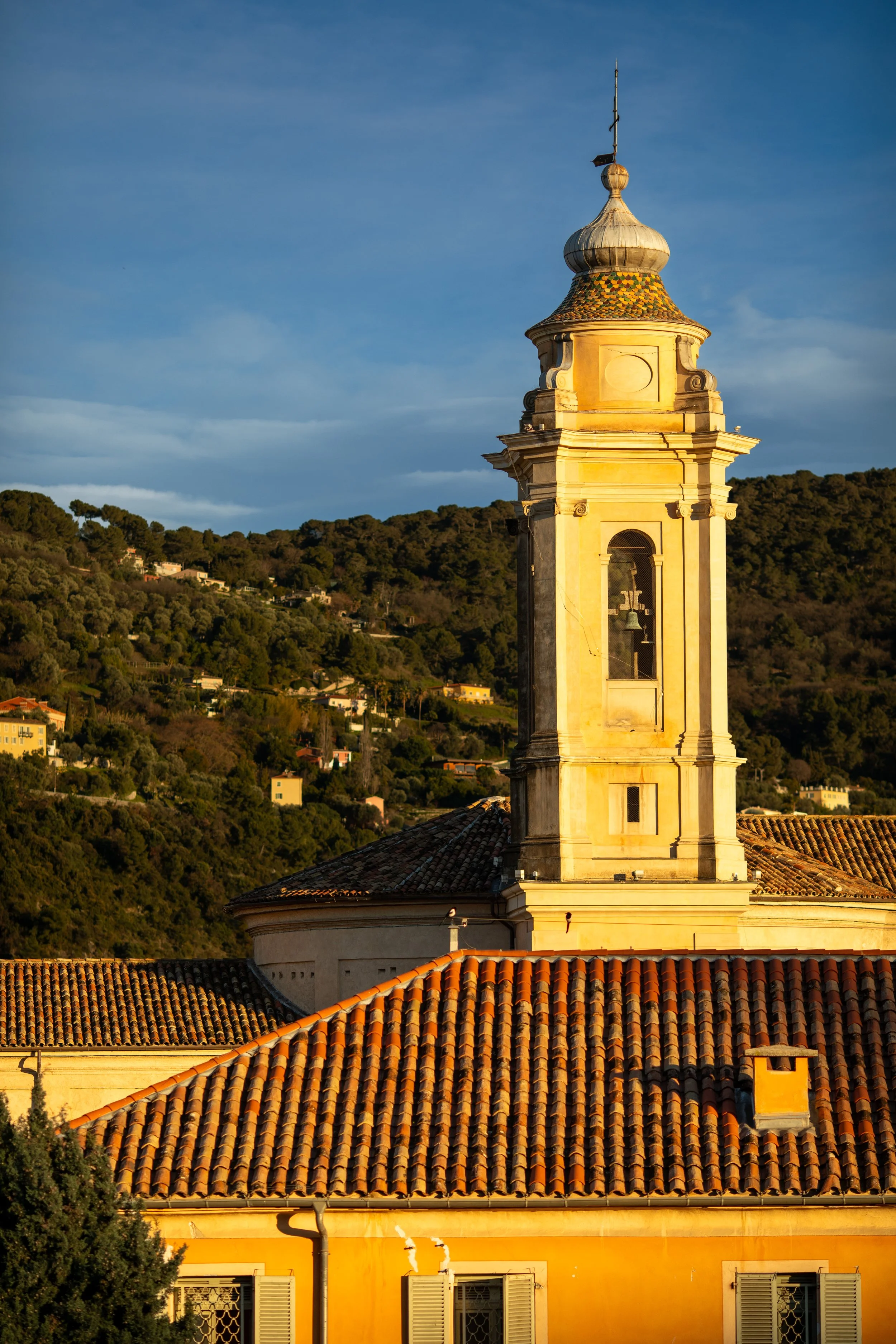 The Gilded Sentinel: As the day ends at the CHU Pasteur campus in Nice, the low sun transforms functional architecture into a study of warmth and texture. The ornate bell tower catches the final, richest rays of light, standing in bold contrast to the cooling shadows of the hillside behind. Below, the rhythmic rows of Mediterranean terracotta tiles anchor the scene, their orange hues glowing against a deepening blue sky.