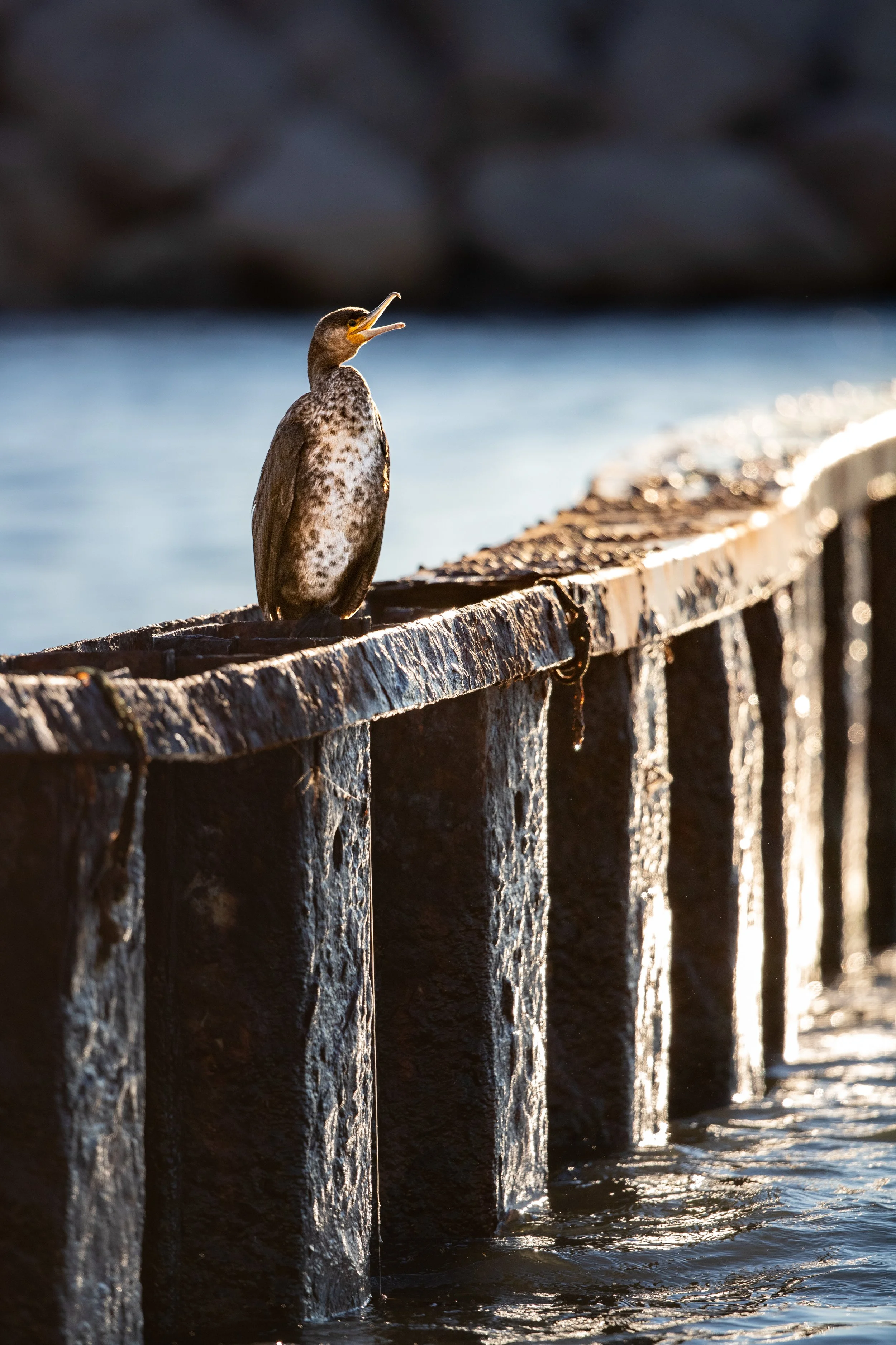 The Iron Stage: A cormorant claims a rugged, oxidised perch at the water’s edge. The low-angled golden hour light perfectly catches the bird mid-call, highlighting the sharp contrast between its organic silhouette and the heavy, repetitive geometry of the rusted metal pilings.