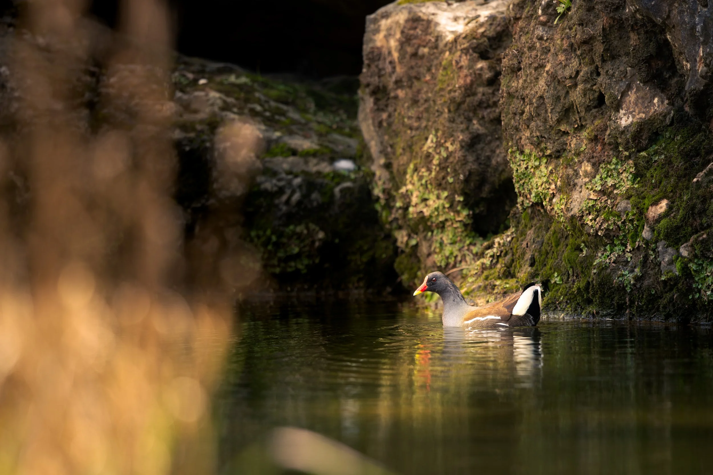 The Red-Shielded Wanderer: In the quiet corners of the pond, where the shadows of the overhanging rocks meet the dark water, this solitary traveler emerged from the reeds. There is a peaceful rhythm to the way they move—bobbing their heads with every paddle, perfectly at home in the muck and the lilies. Captured through the golden blur of the foreground grass, this moment feels like a private glimpse into a world that usually remains hidden behind the rustle of the marsh.