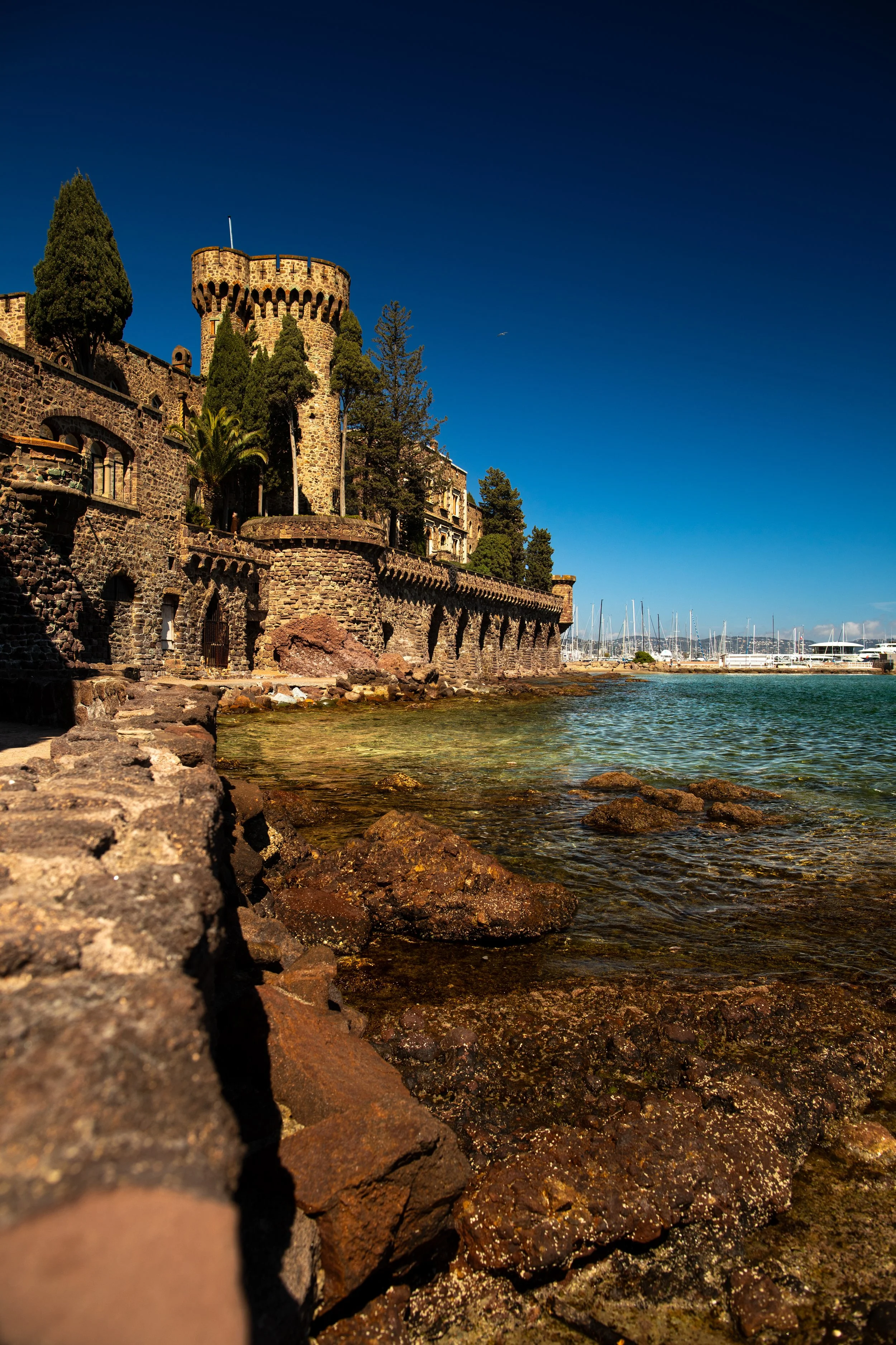 Historical strength: The rugged, reddish-brown stone of the Château de la Napoule stands firm against a perfectly clear sky. The low-angle perspective highlights the fortress's defensive walls as they meet the crystal-clear shallows of the Mandelieu coastline.